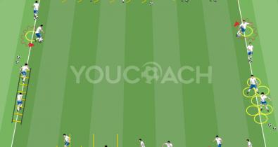 A koncentráció és a gyorsaság edzését célzó pszichofizikai gyakorlás. Az edző utasításainak végrehajtása után a játékosok 1-1 ellent játszanakFizikai felkészítés