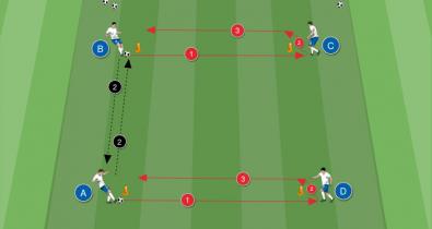 Technikai jellegű gyakorlat 4 játékossal: központban az átadás, a labdaátvétel és a labdabirtoklás pozícióváltoztatássalTechnika