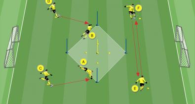 A gyakorlat passzolásokat tartalmazó analitikai szakasszal indul, majd 1-1 elleni szituációval és kapura lövéssel zárulTaktika