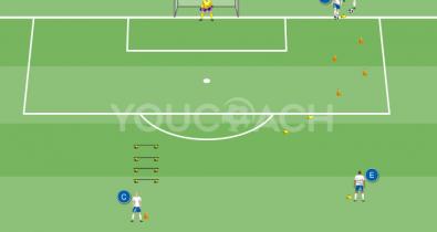 Koordinációs pálya, majd 1-1 elleni szituáció keresztlövéssel egy játékostárs kapura rúgásának segítéséreTechnika