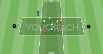 Kisjáték kapura rúgással 3-2 elleni létszámfölényben, amellyel eddzük az átmeneteket és a reakció és az alkalmazkodás gyorsaságát a támadási és védekezési fázisokhozTechnika