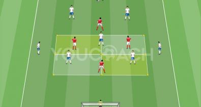 Védők és középpályások tematikus mérkőzése a támadók ellen, amelynek célja a támadásépítés kapura lövéssel és átmenetekkelTaktika