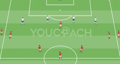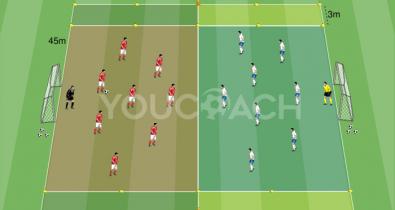 Egyszerűsített játék a védelmi vonal edzéséhez a labda fedezésének és támadásának, a helyezkedésnek és az emberfogásnak a mozgásairaOldalak