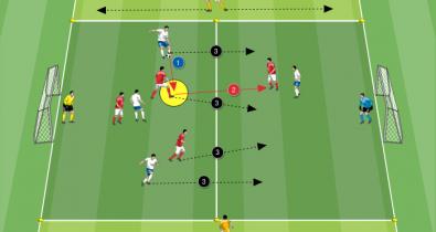 Helyzetgyakorlat, amellyel felkészítjük játékosainkat a kapus segítségével történő labdatartásra, az átmenetek kivitelezésére és a második hullámban történő érkezésreTaktika