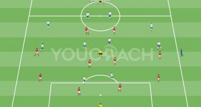 Labdabirtoklás 6 a 6 ellen a játék szélességi felépítésével, a mélységi játék és hosszanti passzok keresésével, labda nélküli befutássalTaktika