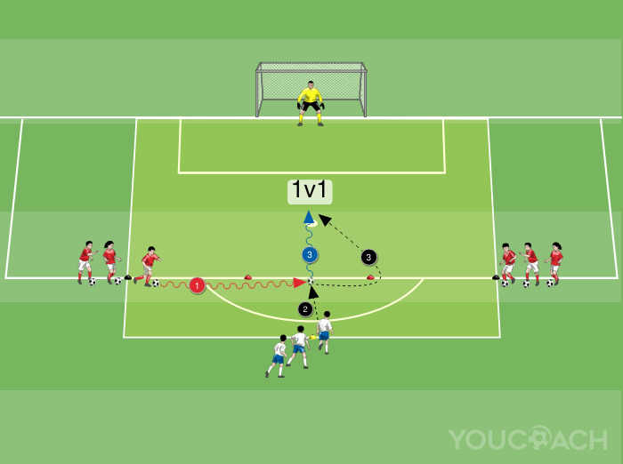 - A sárga tányérbója mögött sorakozzanak fel a labda nélküli játékosok, akiknek a labda megszerzése után kapuralövéssel kell próbálkoznia, kijátszva a visszazárni próbáló védőt (az ábrán a támadók fehérben láthatók)