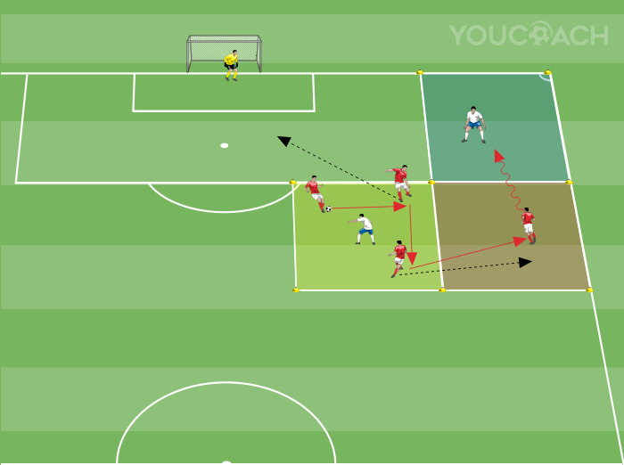 - A 3 támadójátékos célja az, hogy (az edző által előre) meghatározott számú passzolást végezzen anélkül, hogy az ellenfél a labdához érne, majd pedig a labdát a 2. (az ábrán jobbra, a barna) négyszögbe passzolják az ott lévő játékostársuknak
