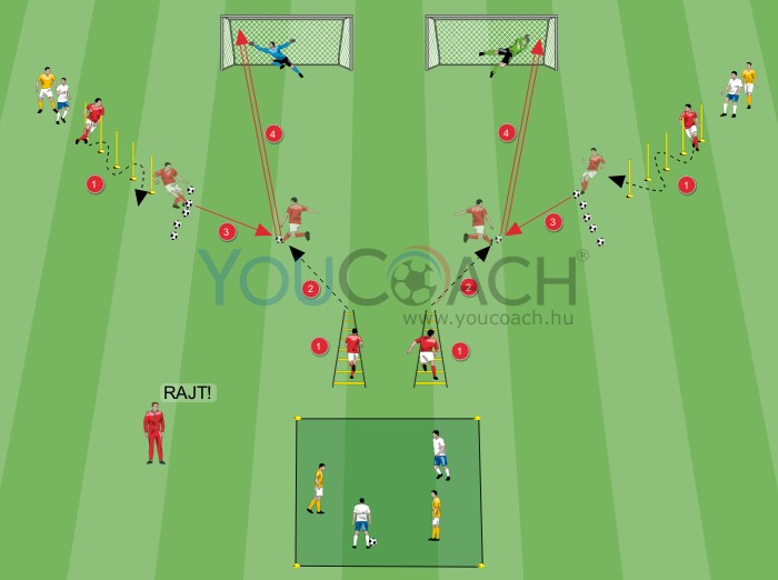 - Az edző jelére (az ábrán „RAJT!”) a szlalompályánál elsőként állókkal megegyező színű mezes 2 játékos (az ábrán a pirosak) kilép a négyzetből és végighalad 1-1 koordinációs létrán, miközben a másik két piros mezes játékos az 5 jelzőrúdból álló szlalompályán halad végig. A szlalomból kiérve a 2 piros játékos labdát passzol a koordinációs létrát befejezett 2 csapattársnak
