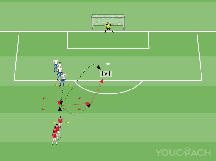 A befejezésekhez használt kaputól nagyjából 20 méterre, a 8 színes tányérbója (vagy bója/jelzőbója) segítségével hozzunk létre egy rombusz alakú technikai állomást. Alakítsunk ki két, egymással függőleges irányban szemközti, körülbelül 1 méter széles, citromsárga átjárót, amik 10 méterre vannak egymástól. Hozzunk létre két, nagyjából 1 méter széles, egymással párhuzamosan szemközti, piros színű átjárót, a köztük lévő távolság legyen szintén 10 méter. A játékosokat osszuk fel 2, egyenként 4 fős csapatra (az ábrán a piros csapat a fehér mezesek ellen), a csapatok indulásra készen álljanak fel a 2 sárga átjárónál. A labda a kapunak háttal álló fehér mezeseknél van, a kaputól távolabbi pirosak labda nélkül kezdenek. A fehér mezes csapat védő, a piros pedig támadó szerepben játszik. A kapus a kaput védi. A rombusz alakú technikai állomás nem pontosan a kapuval szemben található, hanem tőle kissé jobbra. Az első sorozat végén, a második sorozathoz mozgassuk át a technikai állomást a másik oldalra, vagyis a kapuhoz képest a bal oldalra. Minden sorozat felénél fordítsuk meg a csapatok kiindulási pozícióját (a piros mezes támadók védők lesznek, míg a fehér mezes védők támadni fognak).