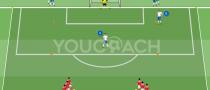 Javaslat kezdőrúgás-variációhoz, ahol a cél 3 a 2 elleni szituáció kialakítása az ellenfél középső védője és szélső hátvédje közötti területen |