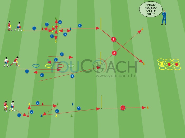 A gyakorlat akkor indul, amikor az edző kimond egy színsort (az ábrán: piros, sárga, zöld és kék). Miután felfogták a színsorrendet, minden csoport első játékosa elindul és labdavezetés közben végigmegy saját sorgyakorlatán.