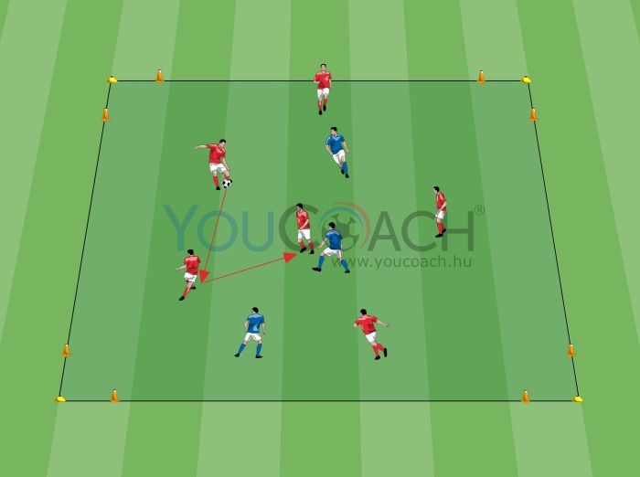- A játékterületen a piros mezes játékosok létszámfölényben végeznek labdatartást (6-3 ellen)