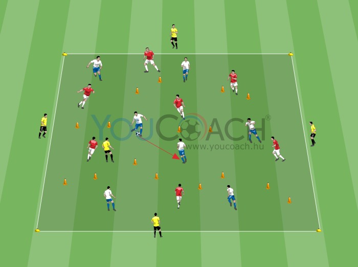 - A jelentős számbeli fölény miatt fontos, hogy a játékosok figyelmét felhívjuk a a labda nélküli, folyamatos mozgásra (valamint arra, hogy a lehető legtöbb passzolási vonalat hozzák létre a labdavivő számára)