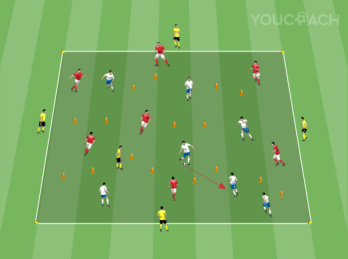 - A jelentős számbeli fölény miatt fontos, hogy a játékosok figyelmét felhívjuk a a labda nélküli, folyamatos mozgásra (valamint arra, hogy a lehető legtöbb passzolási vonalat hozzák létre a labdavivő számára)