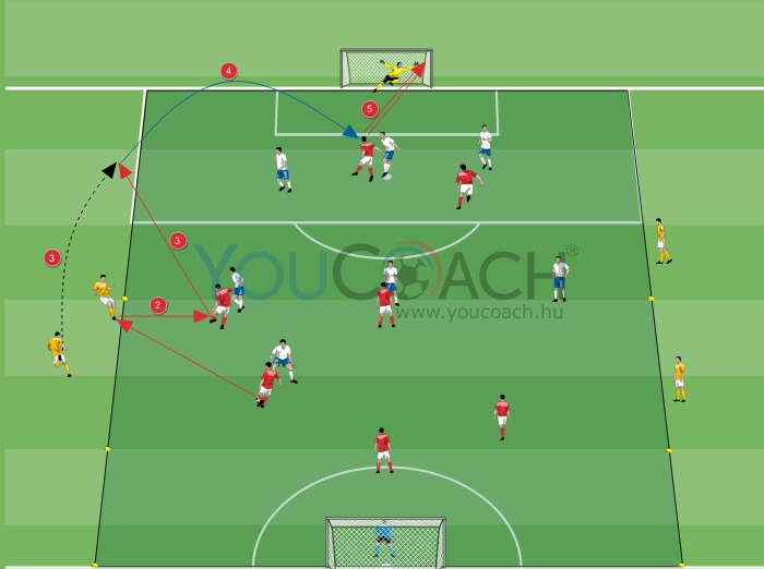 Kisjáték az oldalsávokban történő mögékerülési mozgások és az alapvonaltól a büntetőterületre érkező keresztlövés gyakorlására |