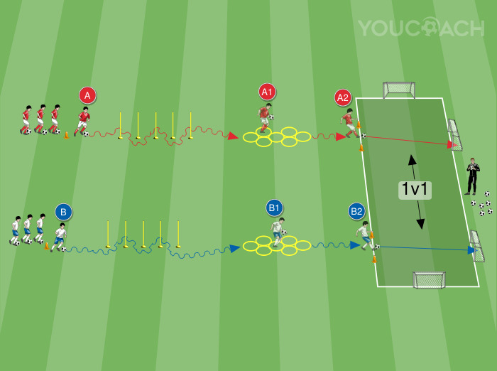 - Az edző bedob a pályára egy labdát, amiért a két játékos 1 az 1 egyben küzd meg azzal a céllal, hogy az ellenfél kapujába juttassa a játékszert. A játékban a munkaállomásokra párhuzamos kiskapuk vesznek részt, vagyis nem az előző lépésben használt kapu (az 1 az 1 elleni szituációban a gólszerzés tehát az ellenfél kapujára történik, ami a játékos saját munkaállomásával párhuzamosan szemben lévő kapu)