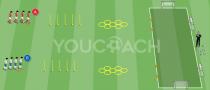 Bemelegítő gyakorlat a játékosok fizikai és mentális ráhangolódásához mozgástudatossági elemekkel és 1 az 1 elleni helyzetekkel, két kapuval |