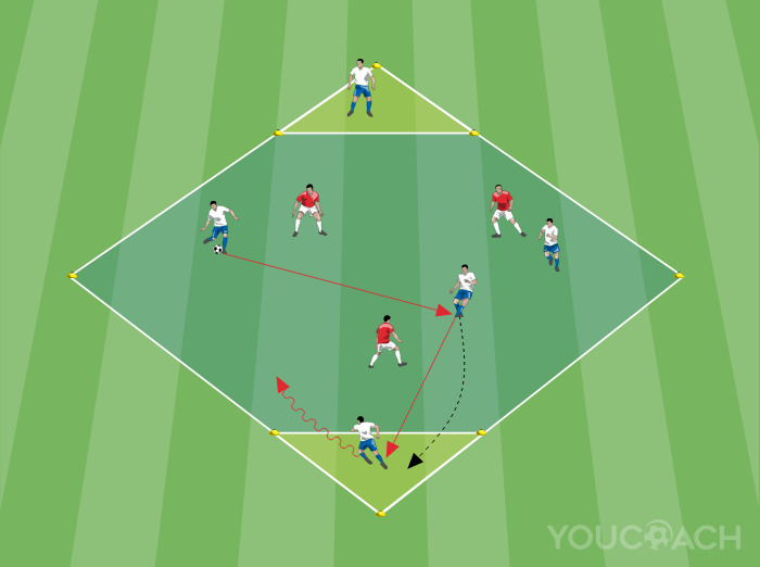 - Ez a bemelegítési fázisban vagy rögtön azt követően kifejezetten hasznos gyakorlat lehetővé teszi, hogy kis területen dolgozzunk a labdatartáson, miközben a résztvevő játékosok mozgékonyságának maximalizálásra törekszünk, akiknek a meghatározott célokhoz (partjátékosok) kell passzsávokat találniuk; amennyiben ezeket a sávokat a védők lezárják, alternatív stratégiák kialakítására kell törekedniük, megpróbálva a lehető legjobban kiszélesíteni a manőver arcvonalát (a rombusz egyedisége adott, hiszen szélessége nagyobb, mint hossza)