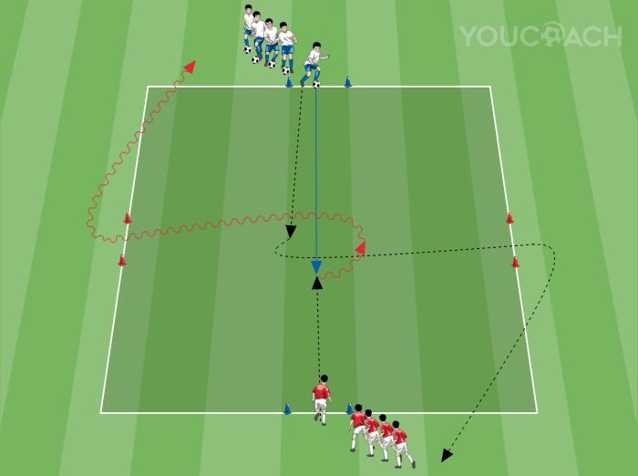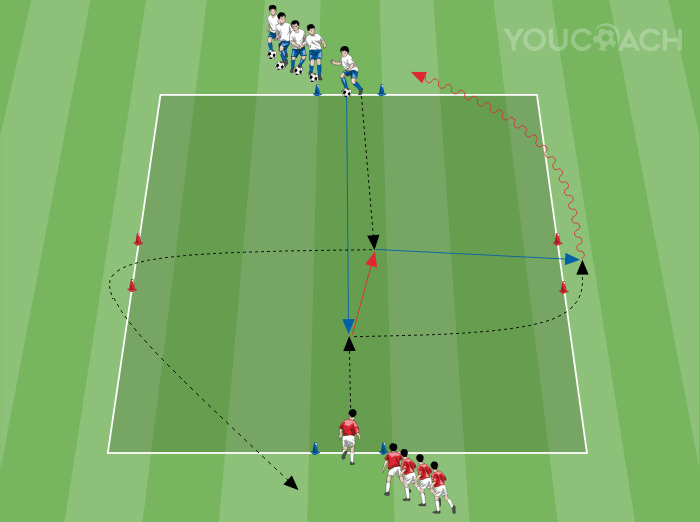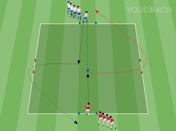 - A piros játékos bal belsővel veszi át a labdát, így „zárva” a tőle jobbra található piros kapu irányába, amin labdavezetéssel halad át és a fent várakozó sor végére áll. Ezalatt az iménti passzt adó fehér játékos irányváltással fut át az ellenkező oldali piros átjárón és a labda nélküli sor végére helyezkedik