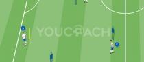 - A gyakorlat alacsony intenzitásúvá válhat. Emeljük ki az előretörés és a befejezés fontosságát, jutalmazzuk az aktuális labdás zónát követő terület sikeres elfoglalását, valamint találjunk ki extra elismerést gólszerzés esetére