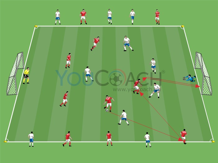 - A partjátékosokat ne csak a pálya hosszabbik oldalaira állítsuk, hanem az ellenfél kapuja melletti rövidebb oldalra is (így tehát nem csak oldalsó partjátékosok lesznek, hanem hátsók is, hogy a hosszanti előretörést segítsék)