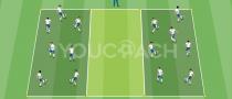 Technikai-koordinációs gyakorlatsor labdavezetéssel és labda nélkül, 1 az 1 elleni befejező játékszituációval és kapura lövéssel |
