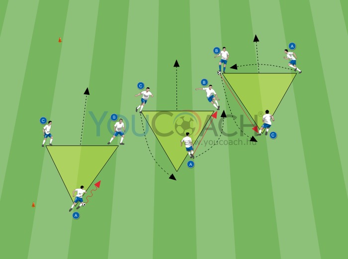 A két bóját tegyük le egymástól nagyjából 30 méterre, ezzel jelezve a pálya hosszát. Osszuk fel a játékosokat háromfős csoportokra, csapatonként egy labdával. A gyakorlathoz a csapatok háromszöget formáznak a pálya teljes hosszát kihasználva. A háromszögek csúcsaiban álló játékosokat minden hármas csoportnál „A”, „B” és „C” betűkkel jelöljük.
