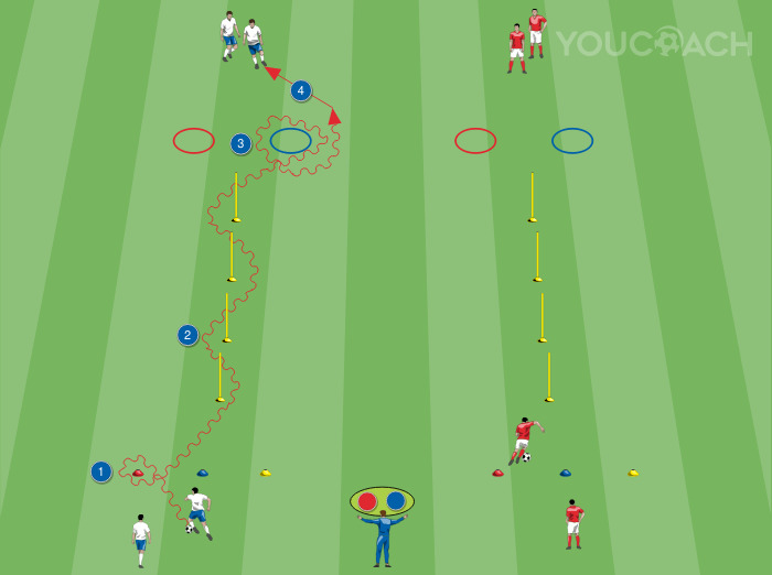 - A játékosok passzolást végeznek ott várakozó társuknak (4. átadás), aki újrakezdi a feladatot az ellenkező irányban haladva, továbbra is betartva az edző által kijelölt színeket