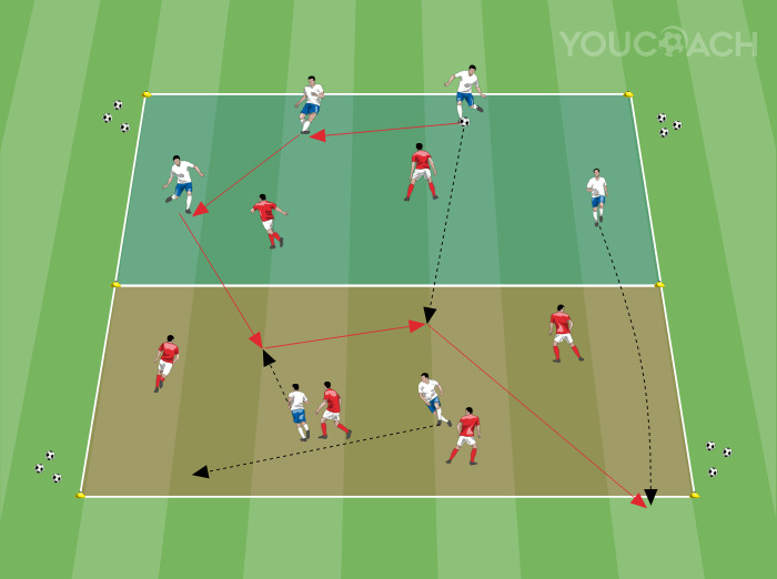- A labdabirtoklással induló csapat a saját félpályáján, 4 a 2 elleni helyzetben kezdeti számbeli fölénnyel indul, mélységből építheti fel a játékát és játszhatja át az ellenfél félpályáját (a példán 4 fehér mezes játékos 2 piros támadó ellen)