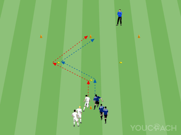 Bemelegítés - Technikai-koordinációs gyakorlatsor labdavezetéssel és labda nélkül, 1 az 1 elleni befejező játékszituációval és kapura lövéssel -