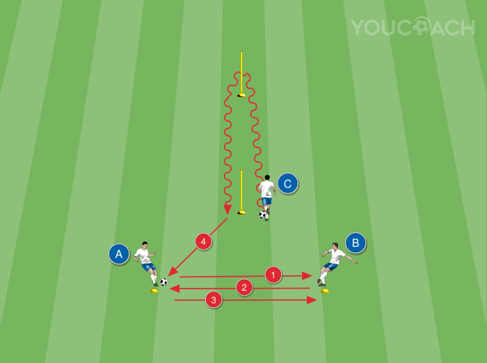 Passzolás - Labdajáratás a védelemben mögékerüléses felfejlődéssel és 2 a 2 elleni befejező szituációval, kapura lövéssel