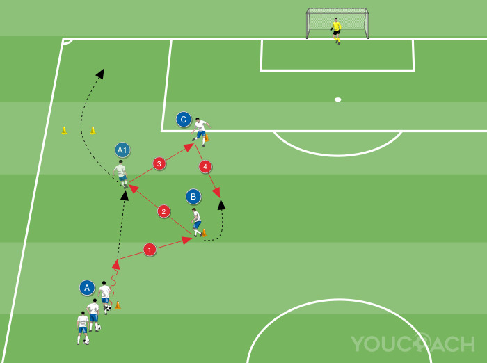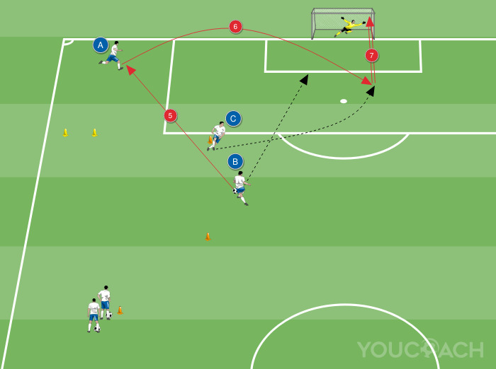 - A passzolás átvétele után az A játékos megállítja a labdát és keresztlövést végez a pálya közepe felé, amely irányba közben a B és C játékos is haladnak, és ezután kapura próbálnak rúgni