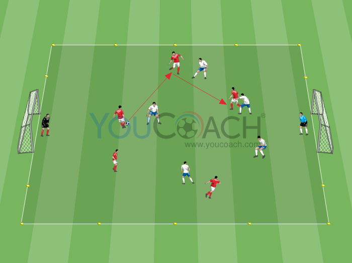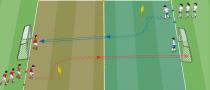 Crie um campo de jogo de 30x40 metros com marcadores. No meio de ambos os lados mais curtos do campo, coloque um gol. Dentro do campo, alinhe duas equipes (5 contra 5 na imagem).