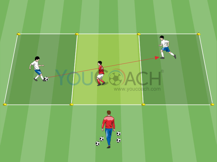 - Os jogadores externos têm que passar a bola com chutes rasteiros rápidos, evitando que o jogador central a intercete