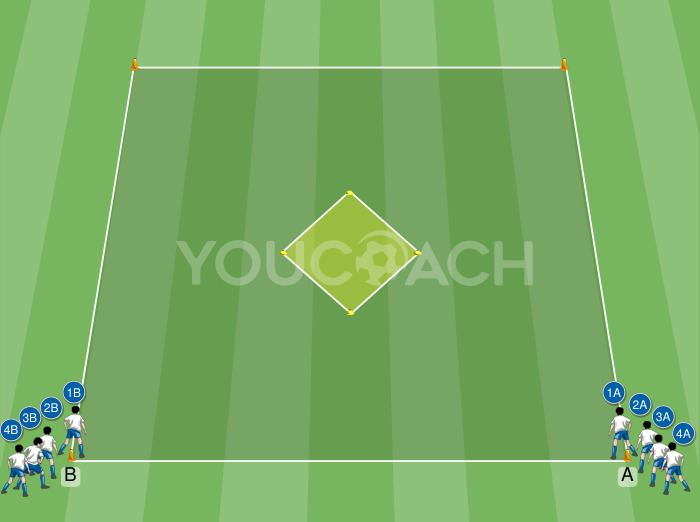 Irányított labdafogadás - Technikai jellegű bemelegítés az átadások, az irányított labdaátvétel és a rendelkezésre álló terület labdavezetés közbeni lefedésének fejlesztésére -
